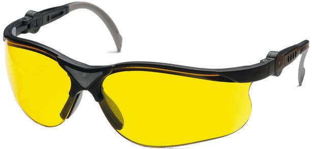 Vernebriller med ripefritt gult glass. UV-beskyttet for bedre beskyttelse i sterkt sollys. Justerbare stenger, og vinkling av glassene. Oppfyller kravene fra EN 166, ANSI Z87+