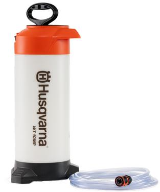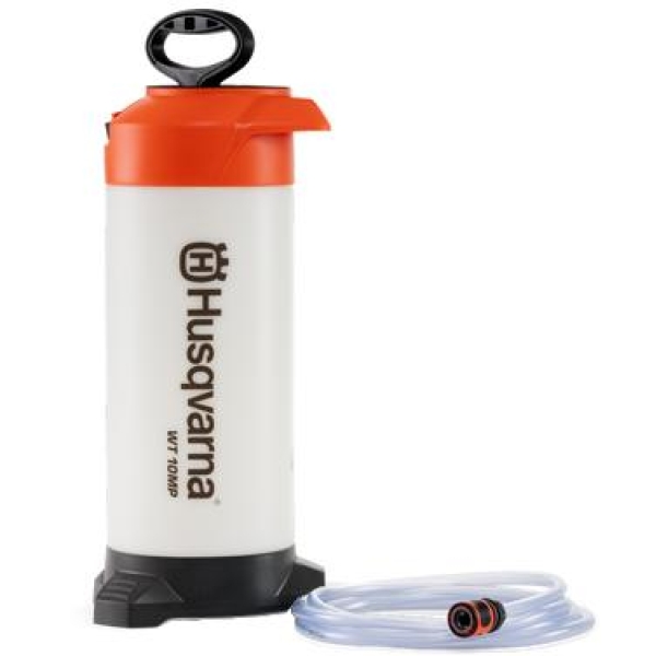 Hvis det ikke er noen vannforsyning i nærheten, kan du bruke en trykksatt vanntank. Ved å pumpe på håndtaket noen ganger får du det nødvendige trykket. Tanken rommer 10 liter og leveres komplett med slange som er koblet til våtkappesettet på maskinen.