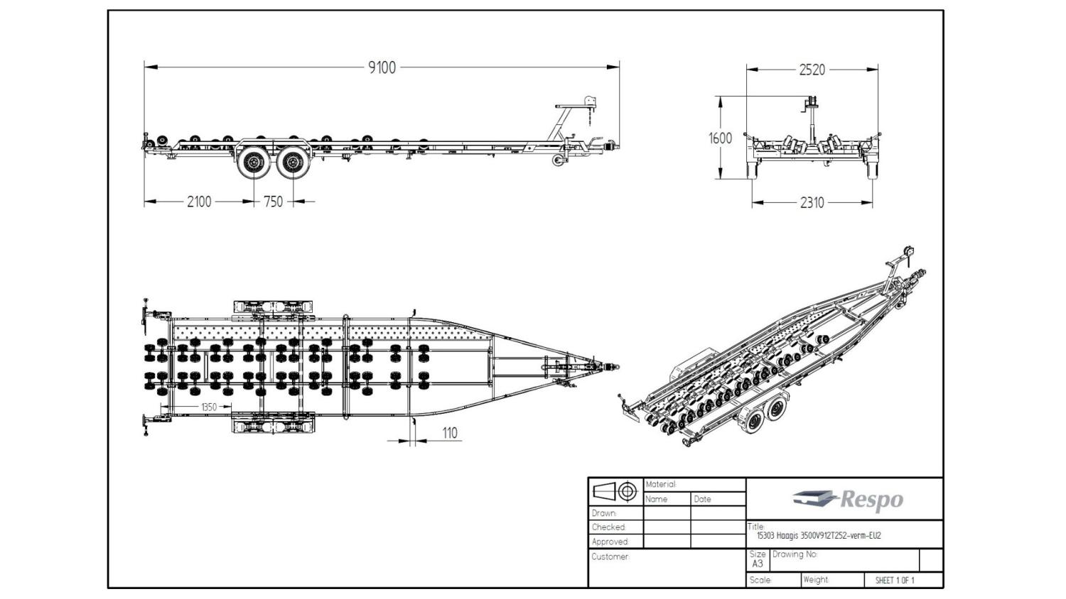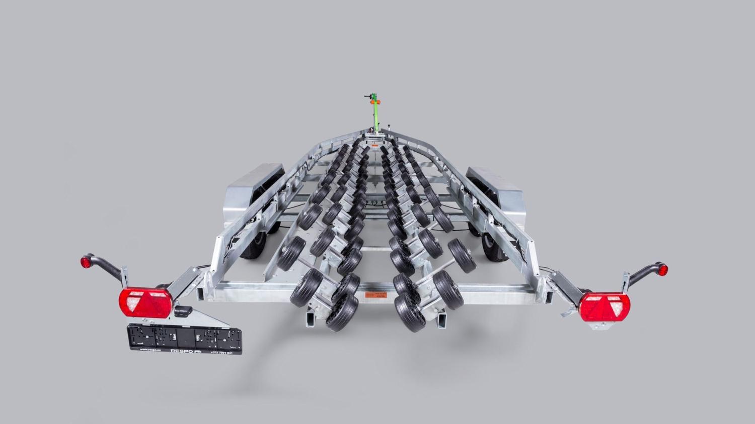 (3500V912T252) Innovativ Multiroller-henger med selvregulerende ruller som sikrer jevn og trygg gang på hengeren under båtopptak og utsetting. Hengeren har en solid varmgalvanisert og helsveiset stålramme. Skjermer og andre komponenter er i høykvalitetsstål med belegg i Magnelis®, som er 3 ganger mer motstandsdyktig mot korrosjon enn vanlig stål som brukes. Alle større hengerene i MR serien har justerbare akslinger som kan flyttes slik at kulevekten kan justeres og tilpasses.