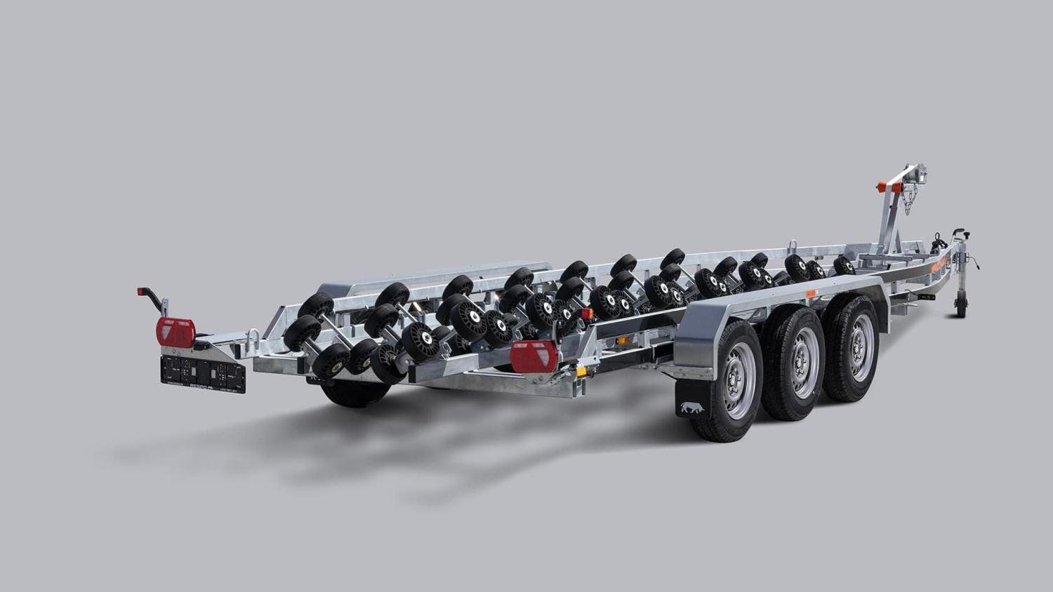 Vår flaggskip båthenger! Denne multirullehengeren med tre aksler og en ultrasterk, galvanisert ramme er designet for ekstreme forhold. Akselposisjonen er justerbar for å finne riktig tyngdepunkt, og det selvjusterende rullesystemet sikrer en mye jevn nere og tryggere av- og pålasting av båten. På grunn av fraværet av kjølruller er denne hengeren også egnet for båter med ikke-standard skrog.