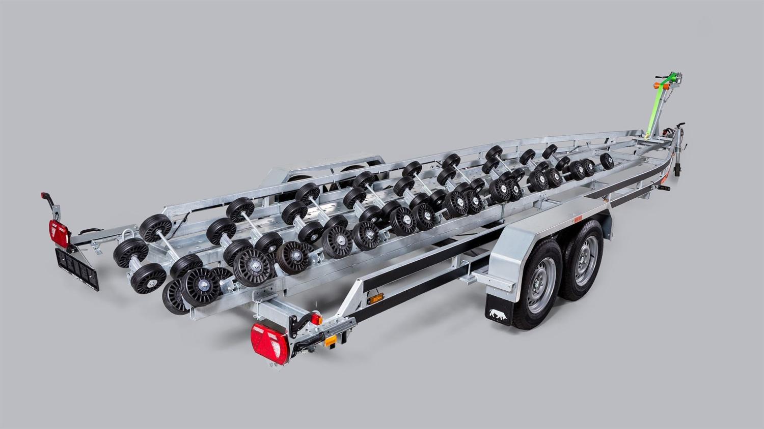 Innovativ Multiroller-henger med selvregulerende ruller som sikrer jevn og trygg gang på hengeren under båtopptak og utsetting. Hengeren har en solid varmgalvanisert og helsveiset stålramme, er uten tippvugge og er først og fremst bygget som en transporthenger/oppplagshenger, men kan registreres.