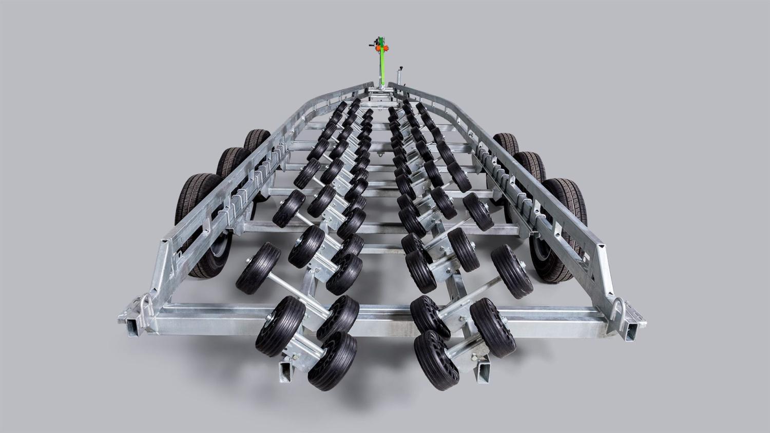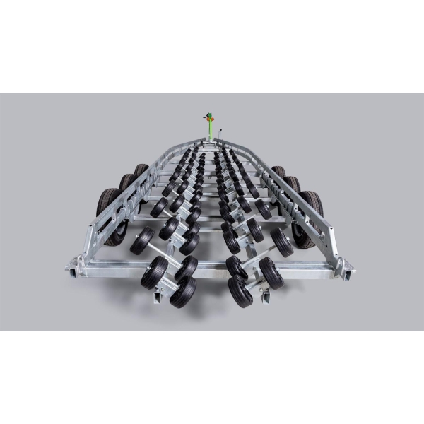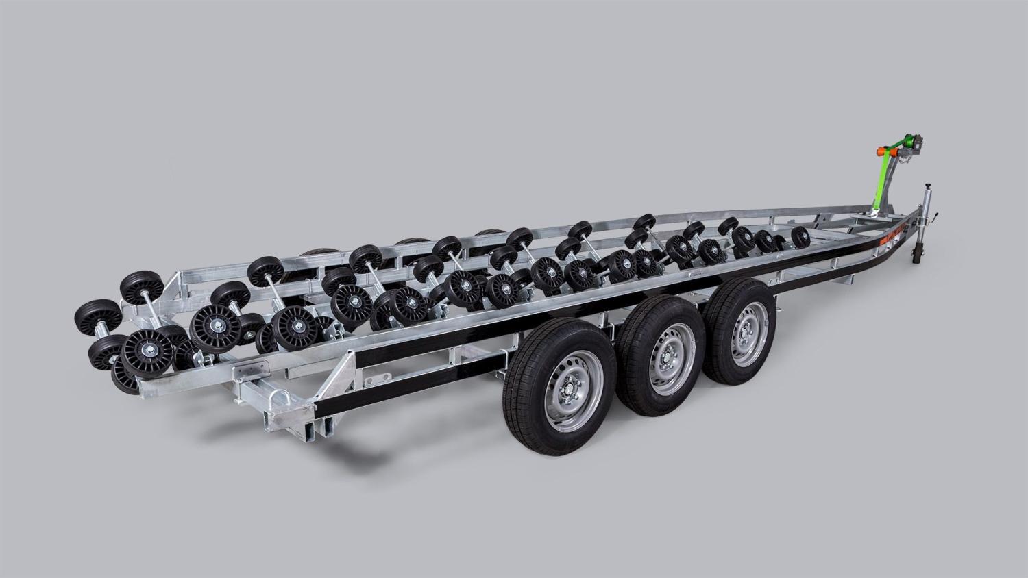 (5000V913J252) Vår største opplagshenger. 64 ruller og en lengde på 9 meter gjør dette til en skikkelig kraftkar.Opplagshengeren har 3 aksler. Den tar båter opp til 29 fot.