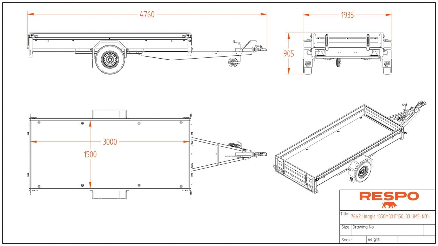(1350M301T150) Kraftige hengsler og mulighet for masse ekstrautstyr som for eksempel ekstra karmsett og reservehjulsholder. Denne modellen har manuell tipp som forenkler av og pålessing av f.eks gressklipper og ATV. Bakkarmen er finerkledd og kan brukes som kjørelem. Denne hengeren har 1350kg totalvekt og er med brems. Skrutipp eller gassdemper kan fås som tilleggsutstyr til tippfunksjonen.
