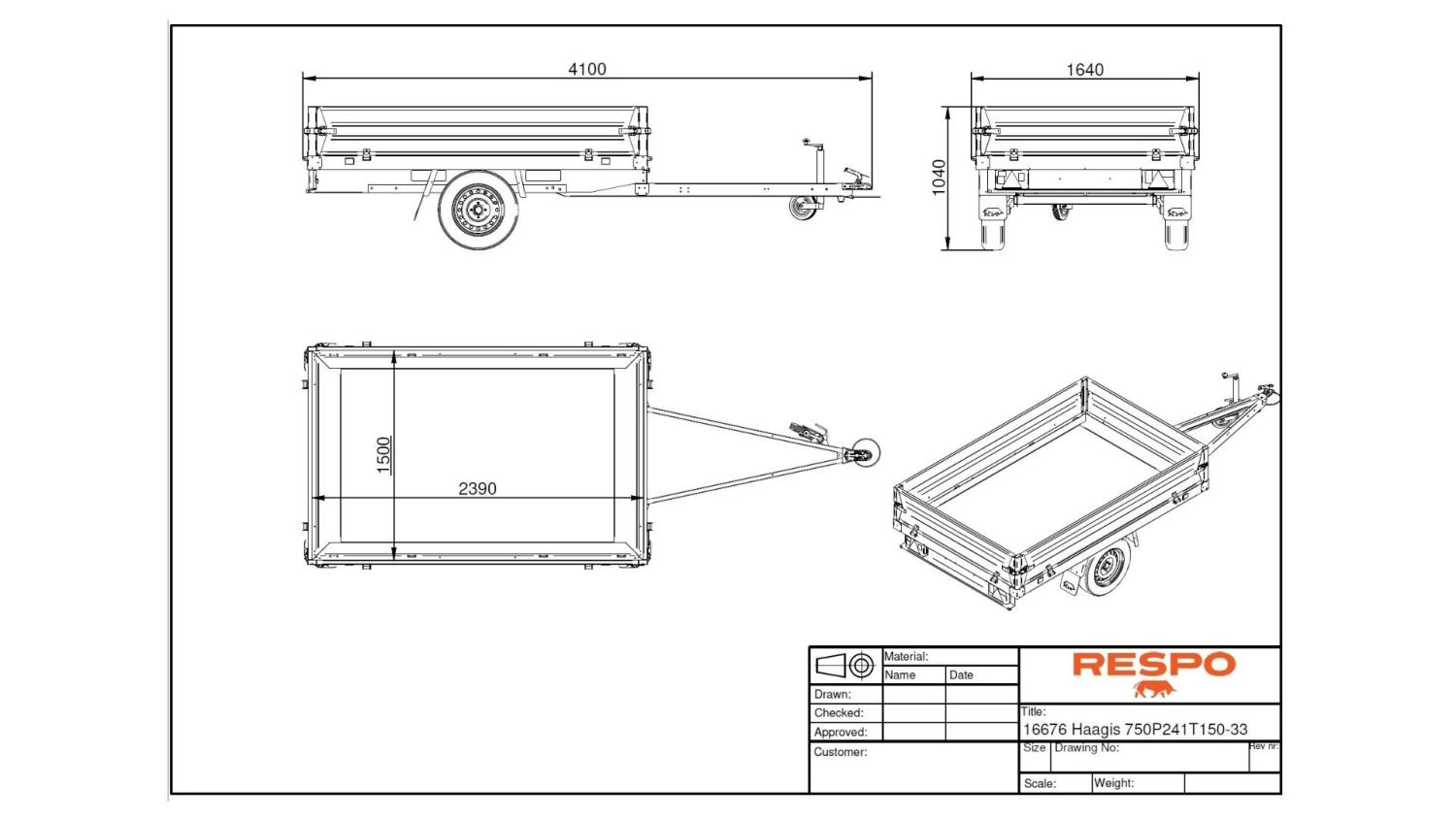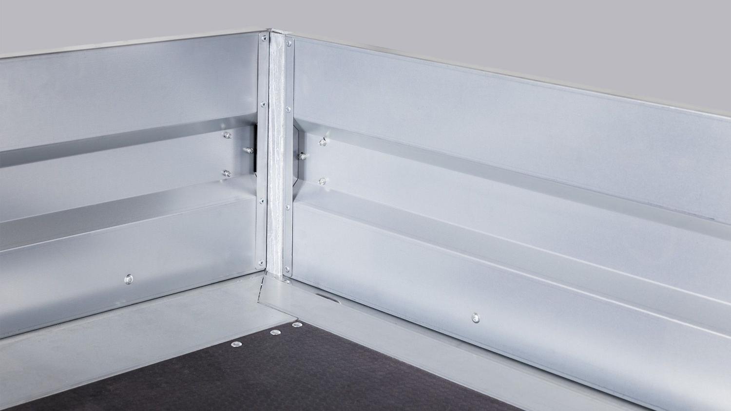 (750P241T150) Karmer og lemmer er laget av en hel stålplate og viktige komponenter, som bunn og sidekarmer er festet sammen med HuckLok® bolter, som er vibrasjonssikre. Overflater er i høykvalitetsstål med belegg i Magnelis®, som er 3 ganger mer motstandsdyktig mot korrosjon enn vanlig stål som brukes. Solide torsjonsakslinger, sammen med vanntette nav gir hengeren en høy slitestyrke og sørger for gode kjøreegenskaper.