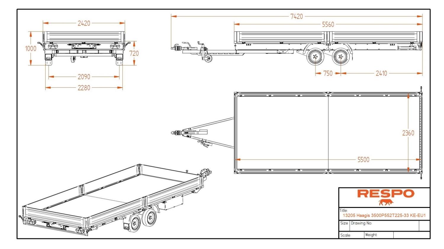 (3500P552T225) Med en ekstremt solid og holdbar varmgalvanisert (HDG) sveiset ramme og lette, men robuste aluminiumssider, samt front- og bakluker. Den doble torsjonsfjæringen gir enestående pålitelighet. I tillegg til vanntetting er bunnen dekket med et sklisikkert belegg. Sidene, front- og baklukene kan enkelt åpnes og fjernes, noe som gir praktisk lastemulighet fra alle sider.