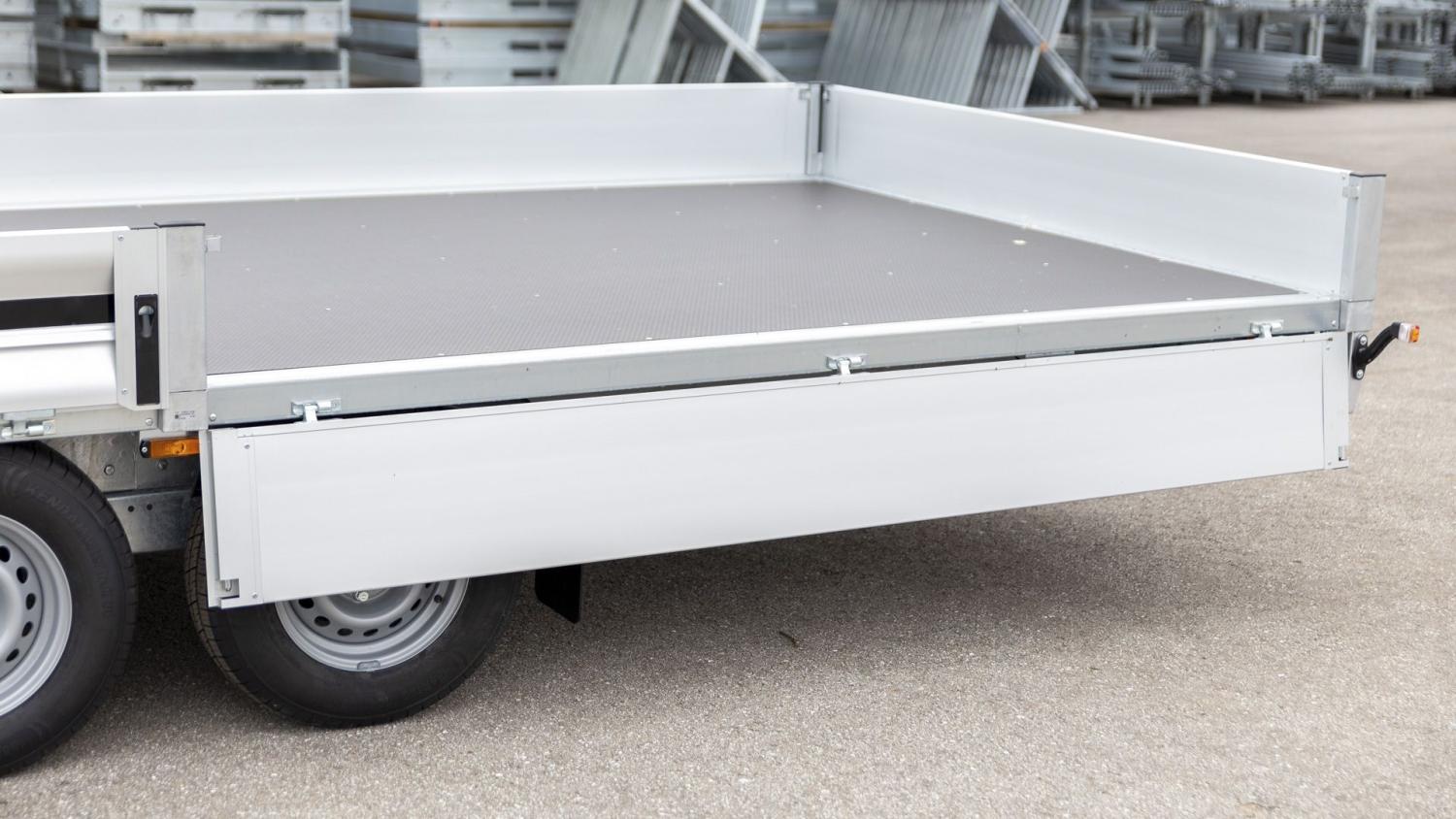 (3500P552T225) Med en ekstremt solid og holdbar varmgalvanisert (HDG) sveiset ramme og lette, men robuste aluminiumssider, samt front- og bakluker. Den doble torsjonsfjæringen gir enestående pålitelighet. I tillegg til vanntetting er bunnen dekket med et sklisikkert belegg. Sidene, front- og baklukene kan enkelt åpnes og fjernes, noe som gir praktisk lastemulighet fra alle sider.